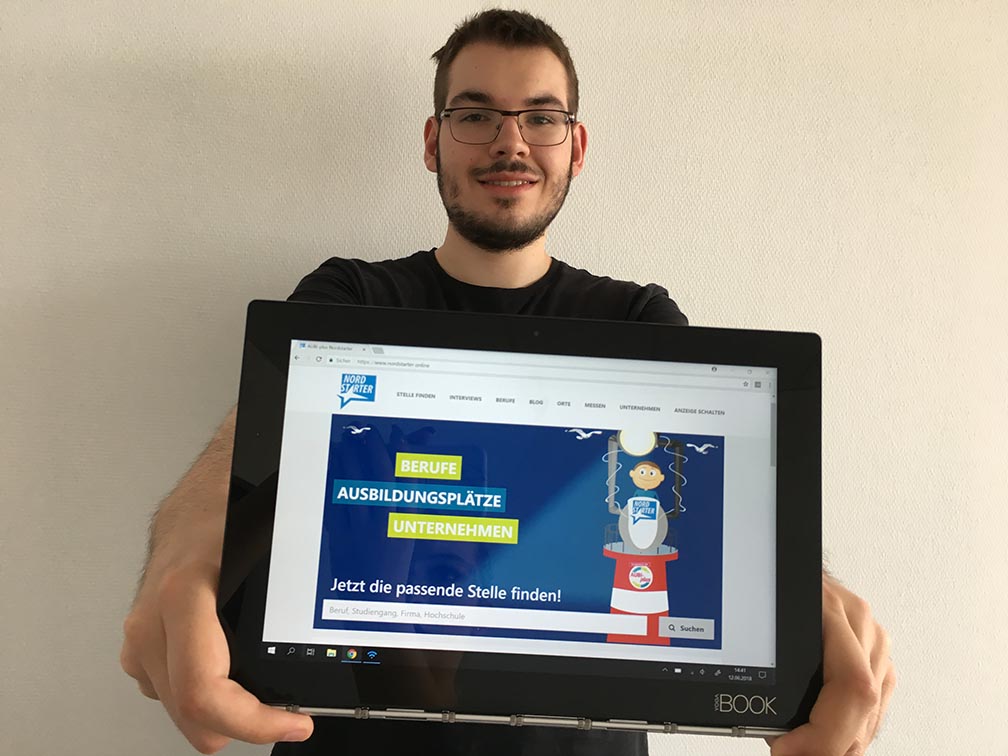 Junior-Entwickler Tobias Drees zeigt stolz die neue Ausbildungsplattform Nordstarter (Bild: AUBI-plus GmbH)